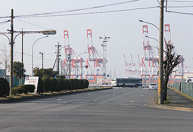 ▲ガントリークレーンを背景に ポートメッセまでラストスパート |