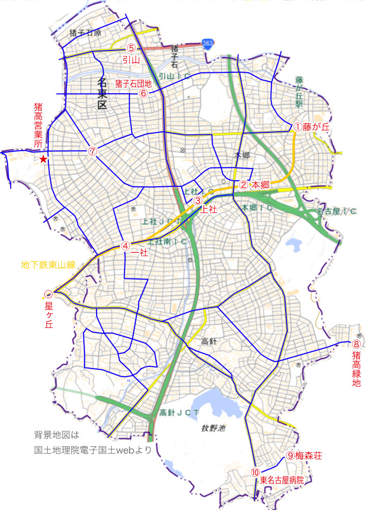 このほか,基幹バスの終点となる引山バスターミナル(5)や猪高営業所(★印)があります.