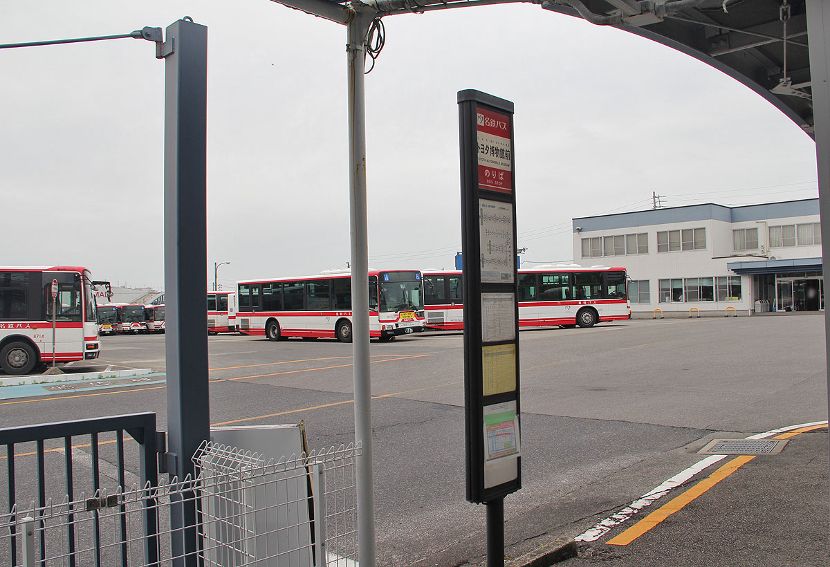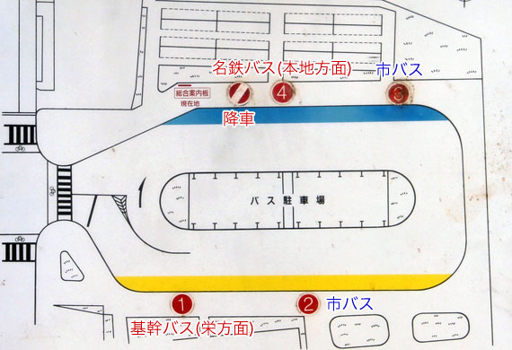 ▲乗降停×4(うち名鉄1),降車停×1 中央にバス駐車場(10両分あり) |