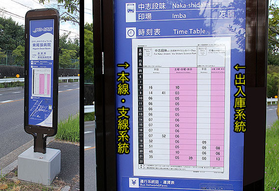 出入庫系統「印場〜上島〜中志段味〜高蔵寺」のうち,単独運行区間(印場〜東尾張病院南)は,市バス停留所を間借りするように時刻表と路線図が掲載されています.