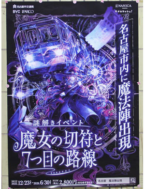 令和7年(2025年)12月23日(火)から令和8年(2026年)6月30日(火)まで,市バス・地下鉄を使って名古屋の街を巡りながら謎を解く体験型謎解きイベント「魔女の切符と7つ目の路線」が開催されます.