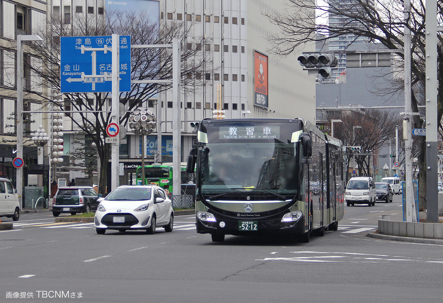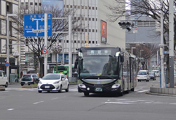 2月13日より運行開始する新たな路面公共交通システム「SRT」の専用車両(全長約18mの連節バス)を使用した,営業ルート(名古屋駅〜栄)での習熟運転が,1月6日(火)より始まりました.
