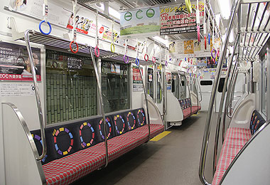 座席は地下鉄開業60周年のロゴマークをアレンジし,車内が明るく楽しくなるようなデザインに.