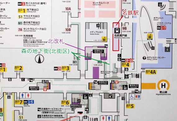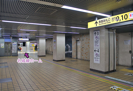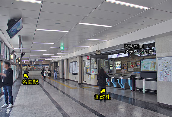 名城線ホームから名鉄瀬戸線乗換,テレビ塔,オアシス21方面は北改札経由が最短です.