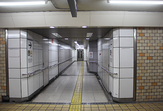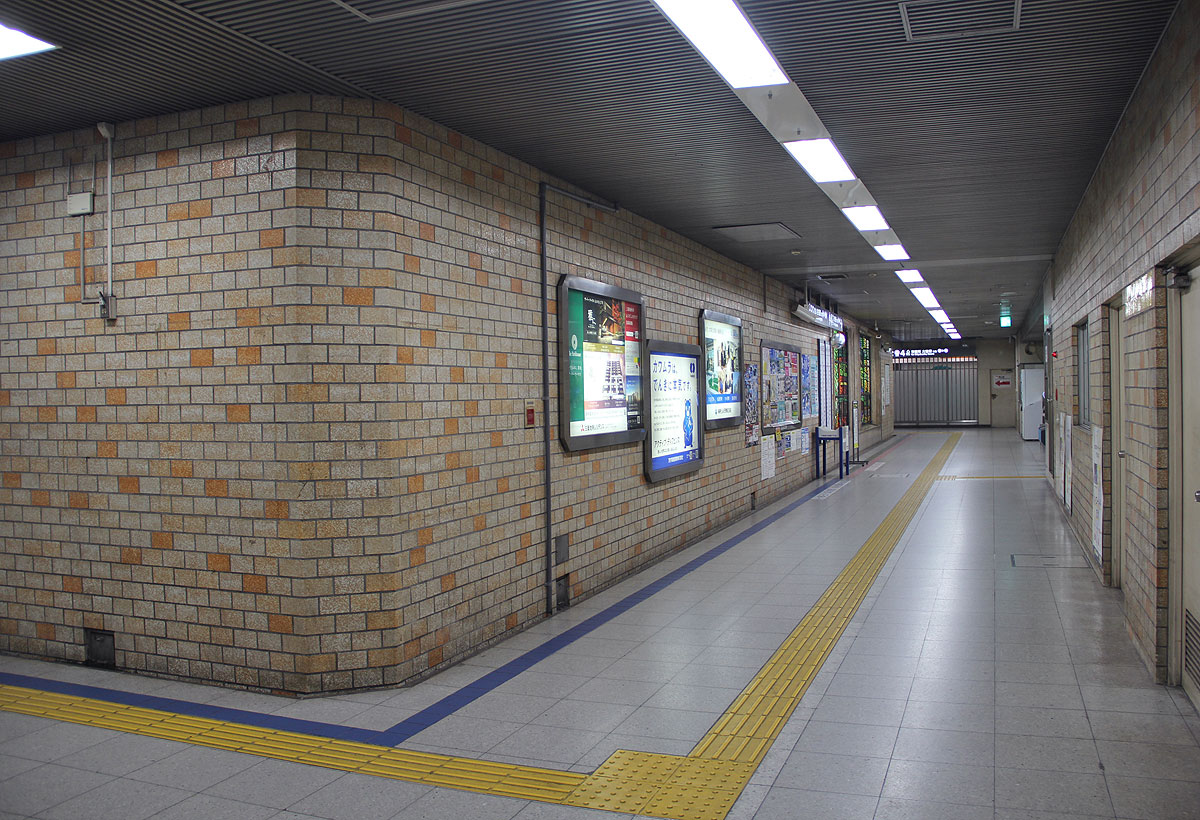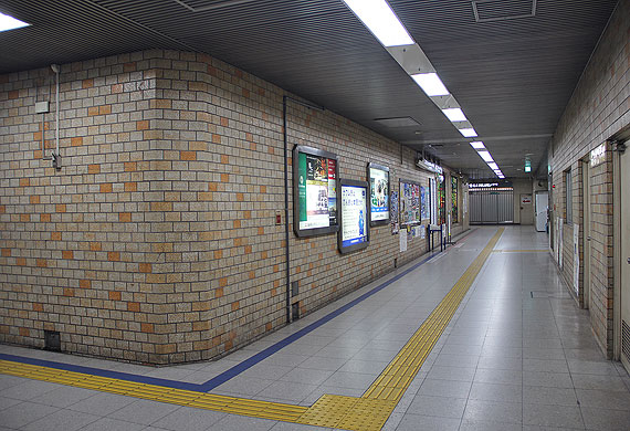 ▲地上出口に続く通路 壁面のうち,地下街部分が乳白色大判パネル,名城線駅部分が青色タイル |