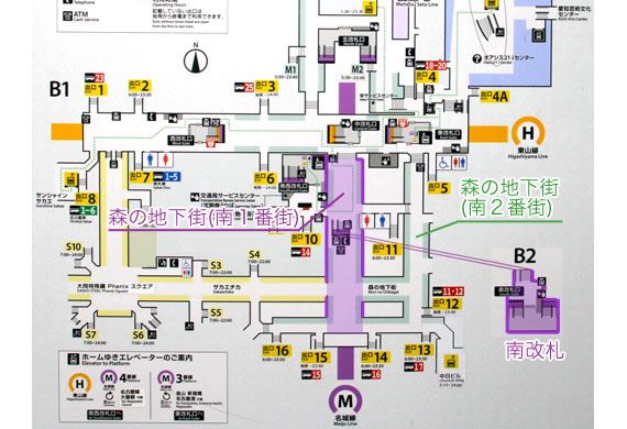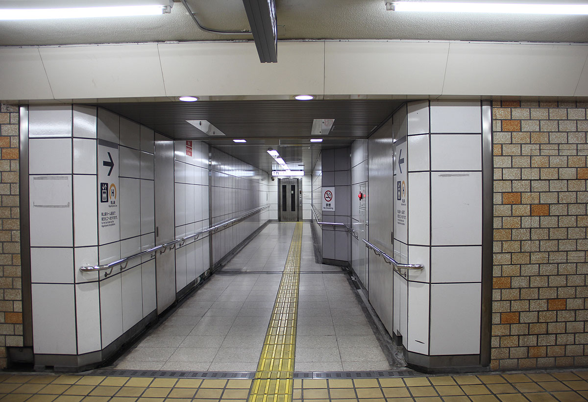 3層構造の名城線構造物のうち,地下1階は地下街(森の地下街南一番街)となっています. 東山線構造物の地下1階とは約1mほど段差があり,段差解消機(EVという名のリフト?)が併設されています.