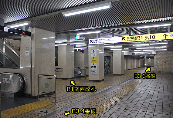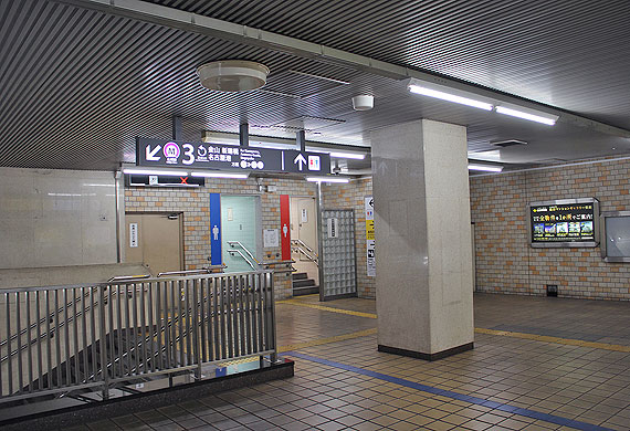 地下3階では,名城線ホーム中央の連絡階段の混雑緩和のため,昭和54年の駅拡張時に,名城線ホームの両サイドにバイパス的な通路が築造されました.