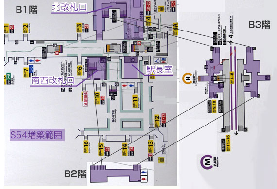 地下2階は南改札口があります. 地下2階部分の大半は機械室等のバックヤードとなっており,かつては運転指令室がありました.