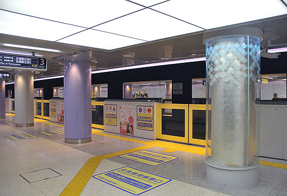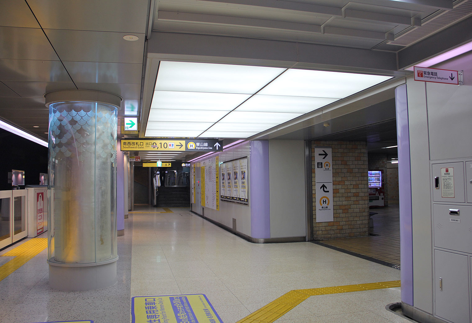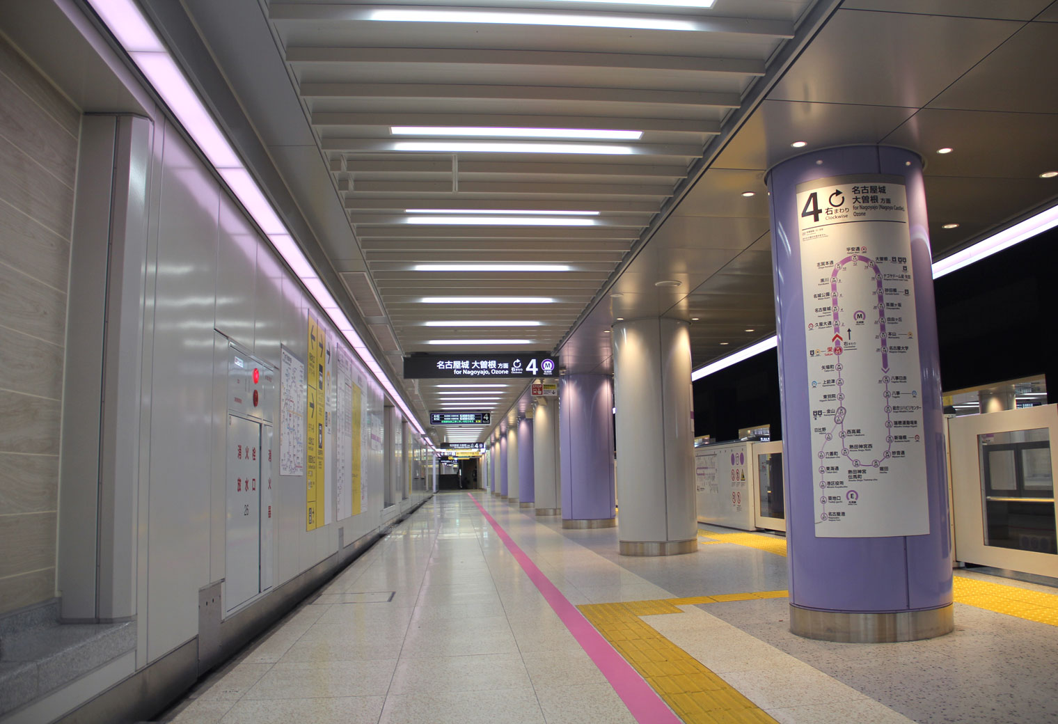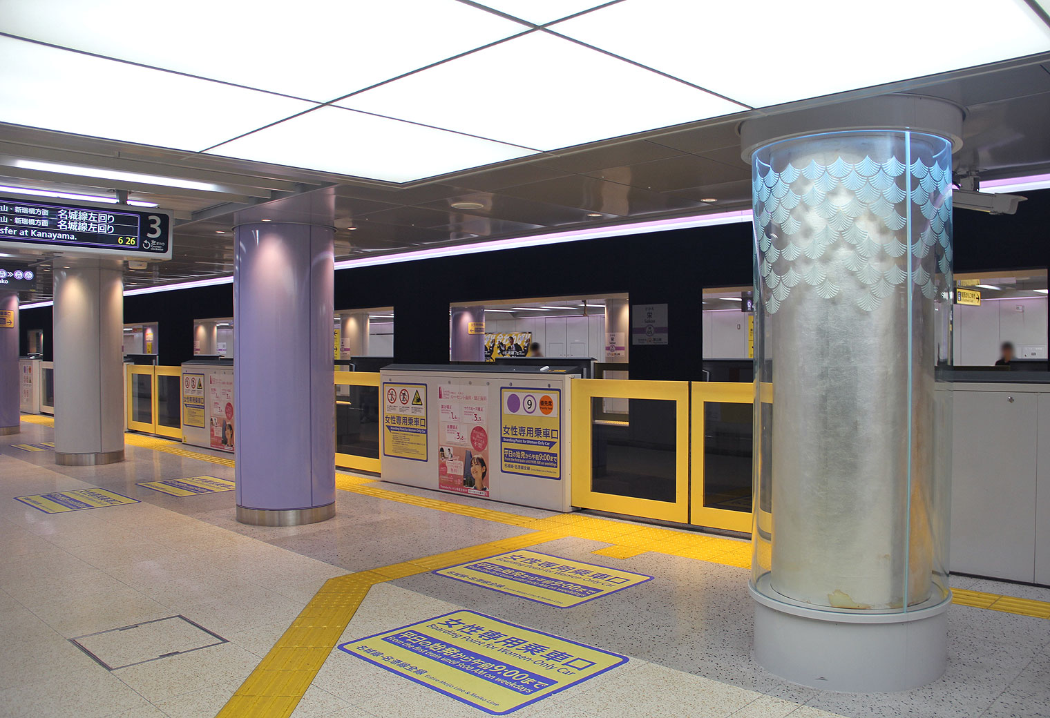 ホームの柱は,白色柱と名城線むらさき色柱のほか,光るデザイン柱の3種類があります.