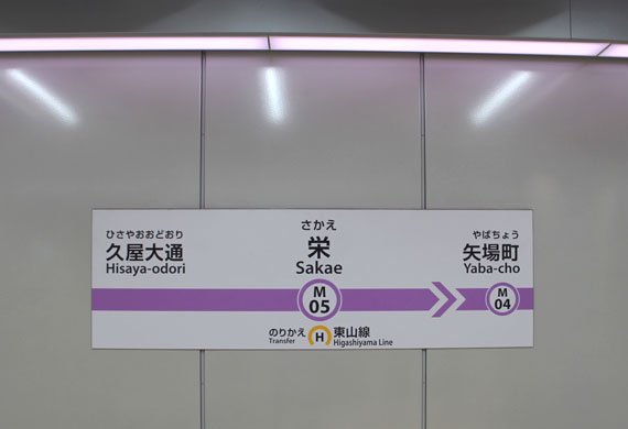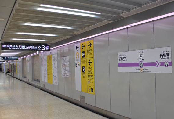 栄駅は東山線駅と名城線駅が十字に交差した2駅一体型の駅で,ホーム直結の連絡階段を利用し短時間で乗り換えできるとても便利な駅です.