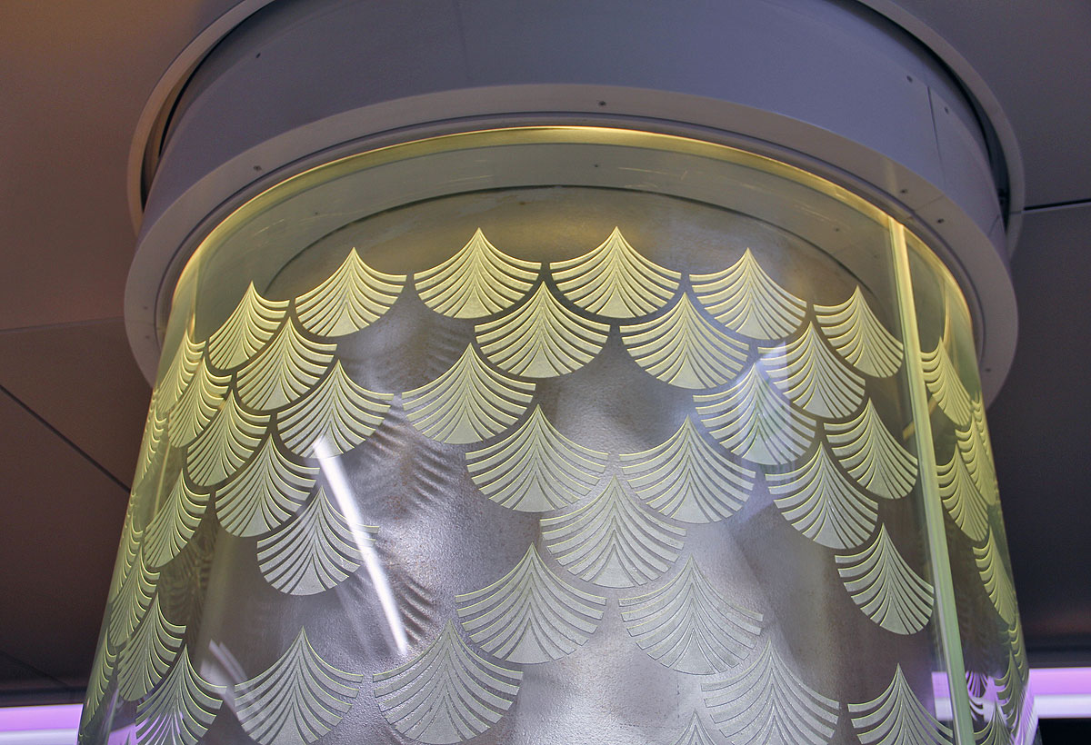 ←デザイン柱は,中心に銀箔を施した柱があり,それを覆うガラス面には「沈銀」という技術で中区の木「イチョウ」をデザイン |