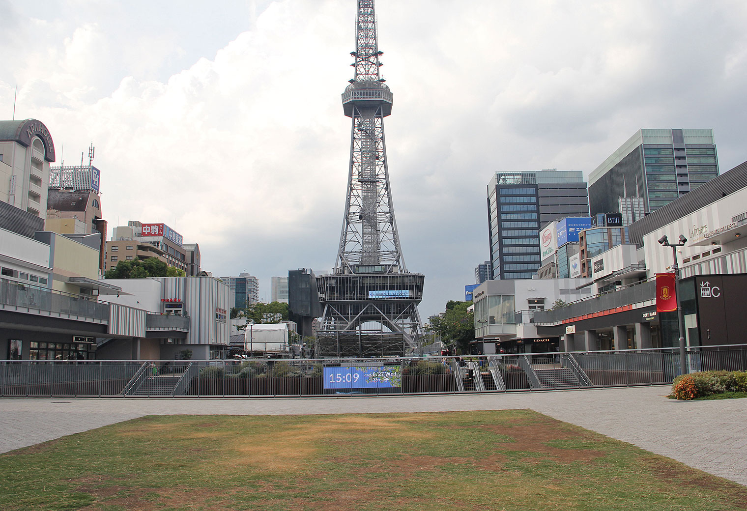 夜もにぎやかな歓楽街,100m道路中央の久屋大通公園もあり,名古屋市を代表する繁華街・ビジネス街です.