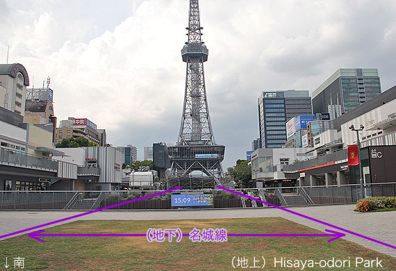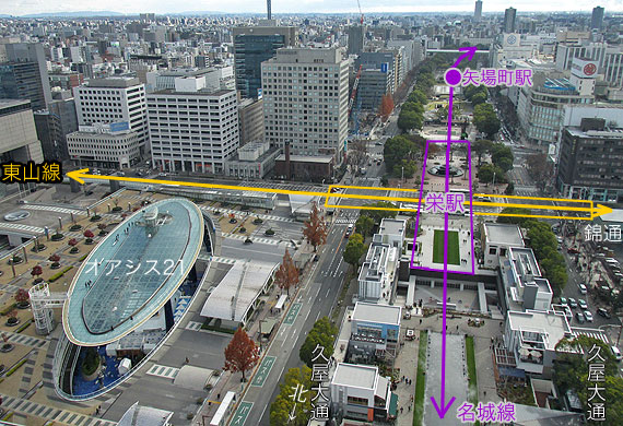 地下鉄名城線は「久屋大通」の下を通っています. 交差する東山線は「錦通」の下です.