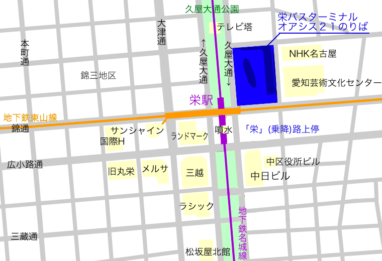 栄駅の北東の「オアシス21」には バスターミナル も設置されています.