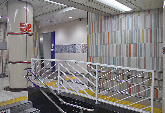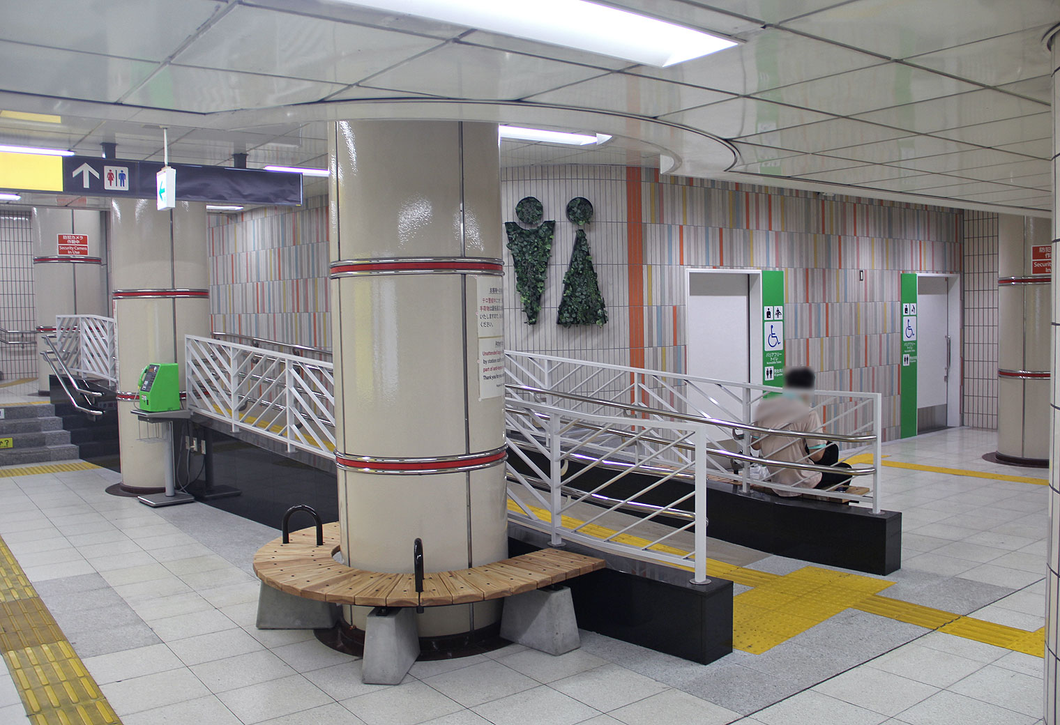 外観は,駅周辺のにぎわいをカラフルなタイルで表現しています.スロープは新瑞橋の欄干をモチーフにしています.トイレ横には親子で腰掛けられるよう幅広のベンチが設置されています.