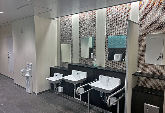 トイレ内装は,山崎川をイメージした水色のガラスモザイクタイルが使用されています.