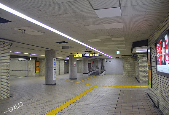 ▲B1階コンコース 最西端部にトイレあり 左は3,4番,右は1,2番出口通路 |