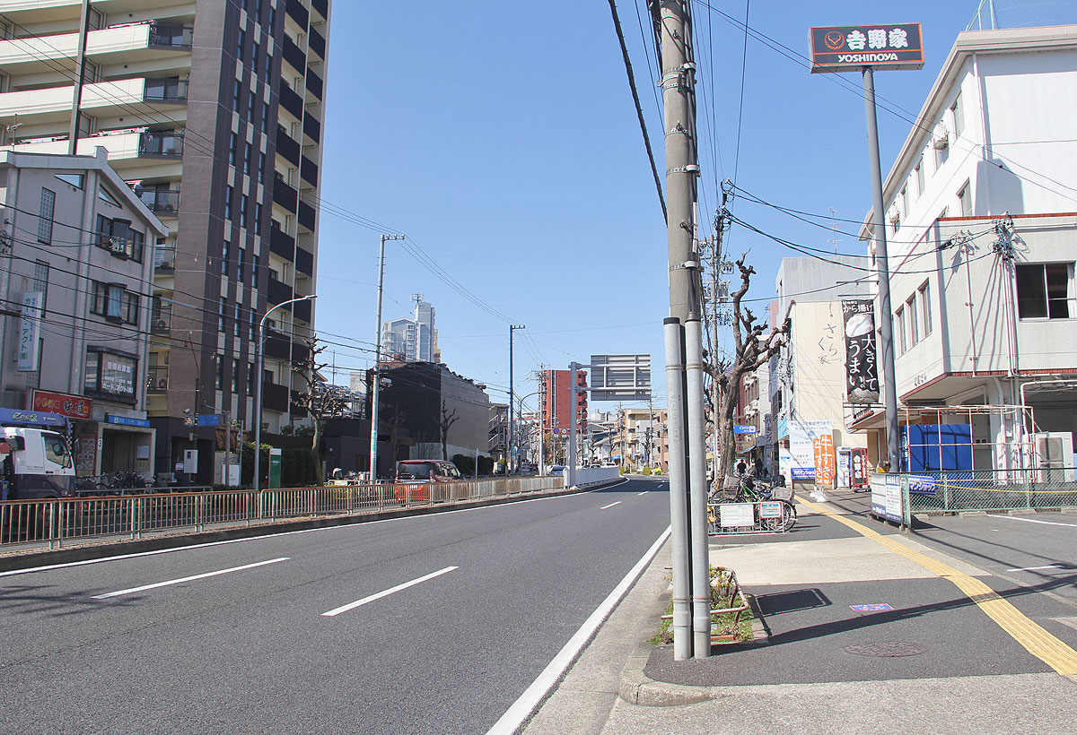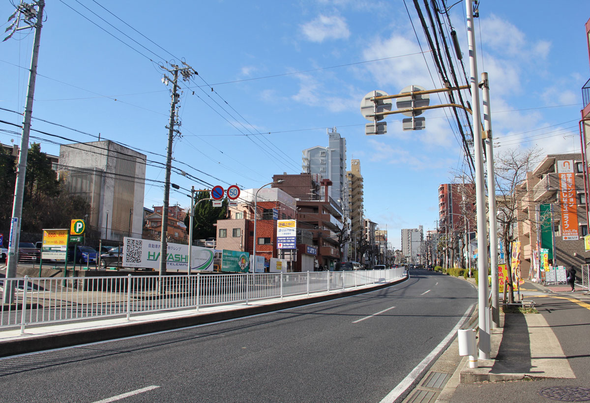 駅の南側は台地となっており,台地の上に駅名称の由来となった塩竈神社があります. その周辺や駅東側は閑静な低層住宅街が広がります.