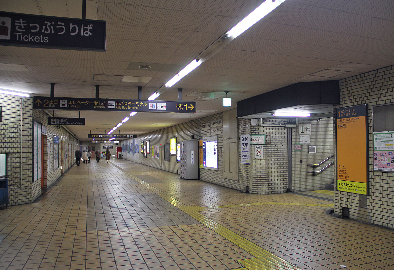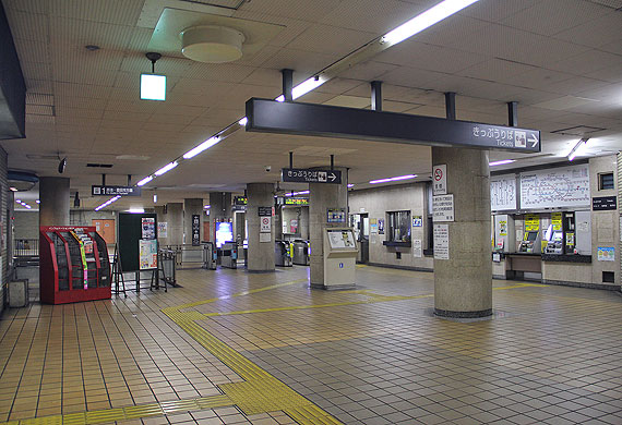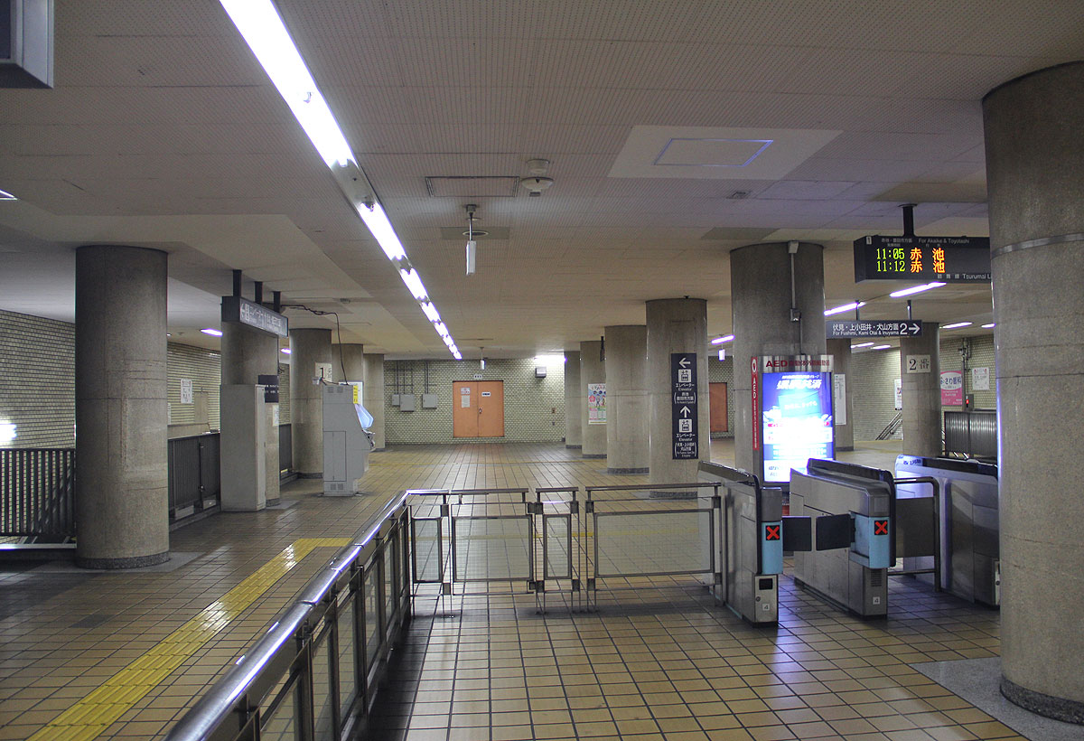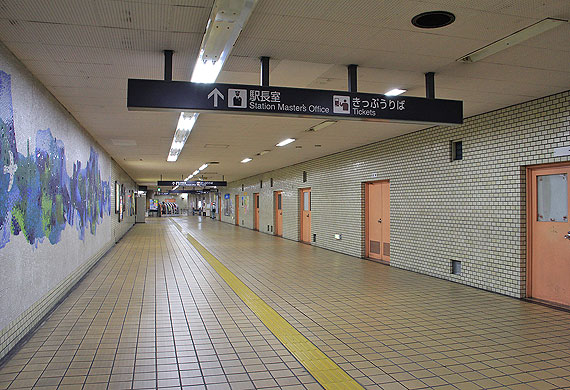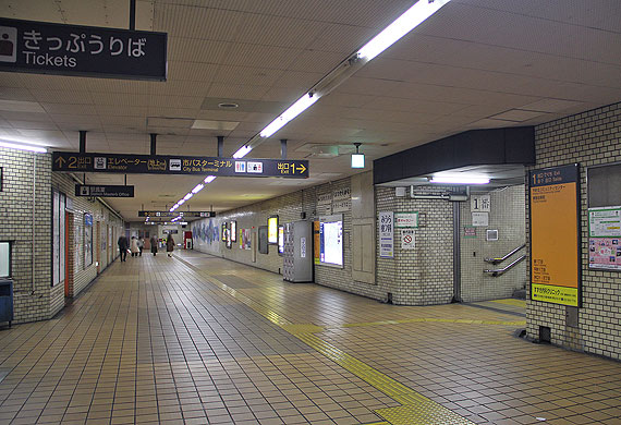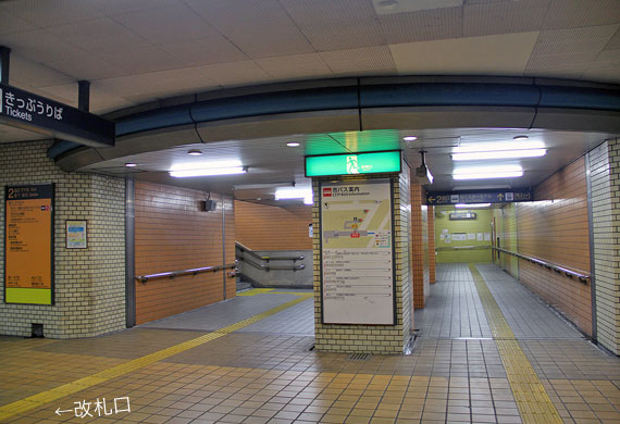 原駅は地下2層構造の駅です. 地下1階はコンコースで,改札口は1ヶ所あり,西端部の2番出入口に向かって通路が伸びています.通路の傍には駅務諸室が並びます.
