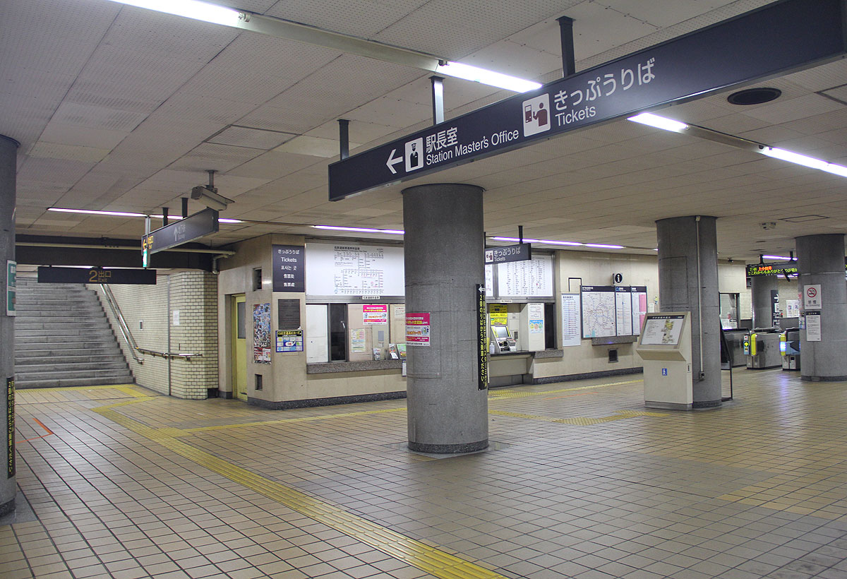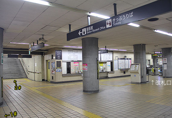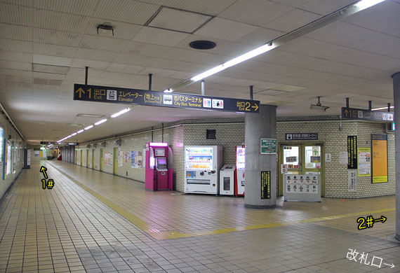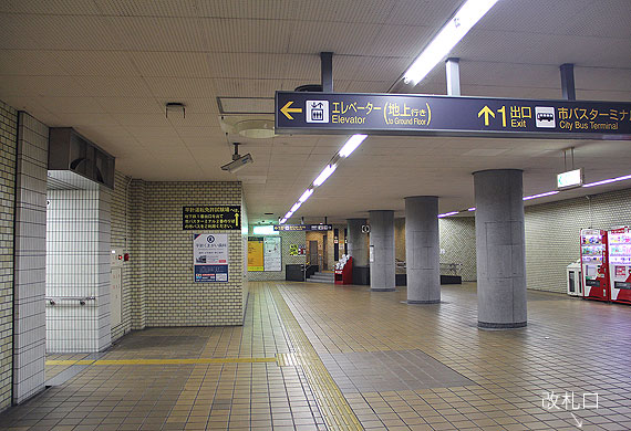 平針駅は地下2層構造の駅です. 地下1階はコンコースで,改札口は1ヶ所あります. 東端部の1番出入口に向かって通路が伸びています.通路の傍には駅務諸室が並びます.