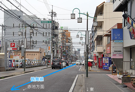 鶴舞線は幹線道路の北側を平行して走る片側1車線の市道の下にあります.
