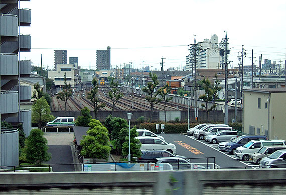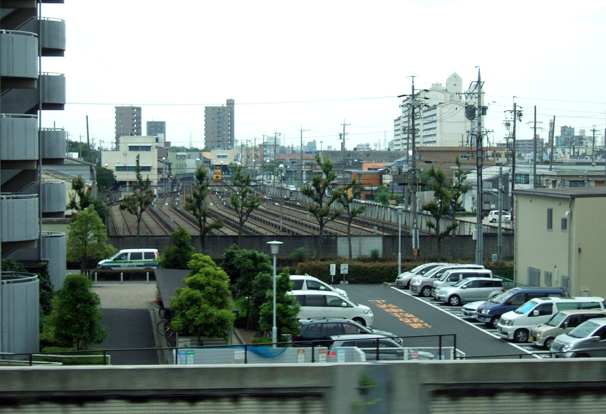 出入庫線の先,高畑車庫の東側は留置線9本(4番線〜12番線)が並びます.