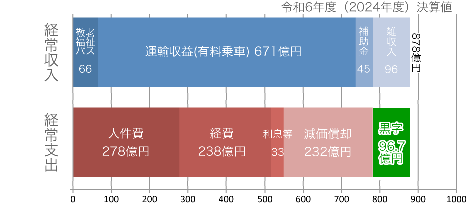支出面では,人件費が約2億円の微増し,電車動力費や施設修繕費など経費が約12億円増加したものの,支払利息が約15億円減少したため,経常支出は約784億円(対前年比17億円減)と減少しました.