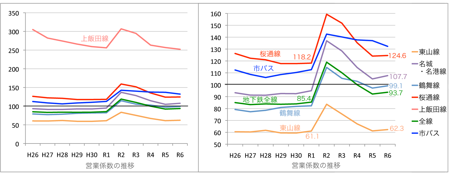 全国でも有数の優良路線である地下鉄東山線の営業係数は約60で推移してきましたが,R2年度に75.4まで悪化.R4年度より60台に戻しました.