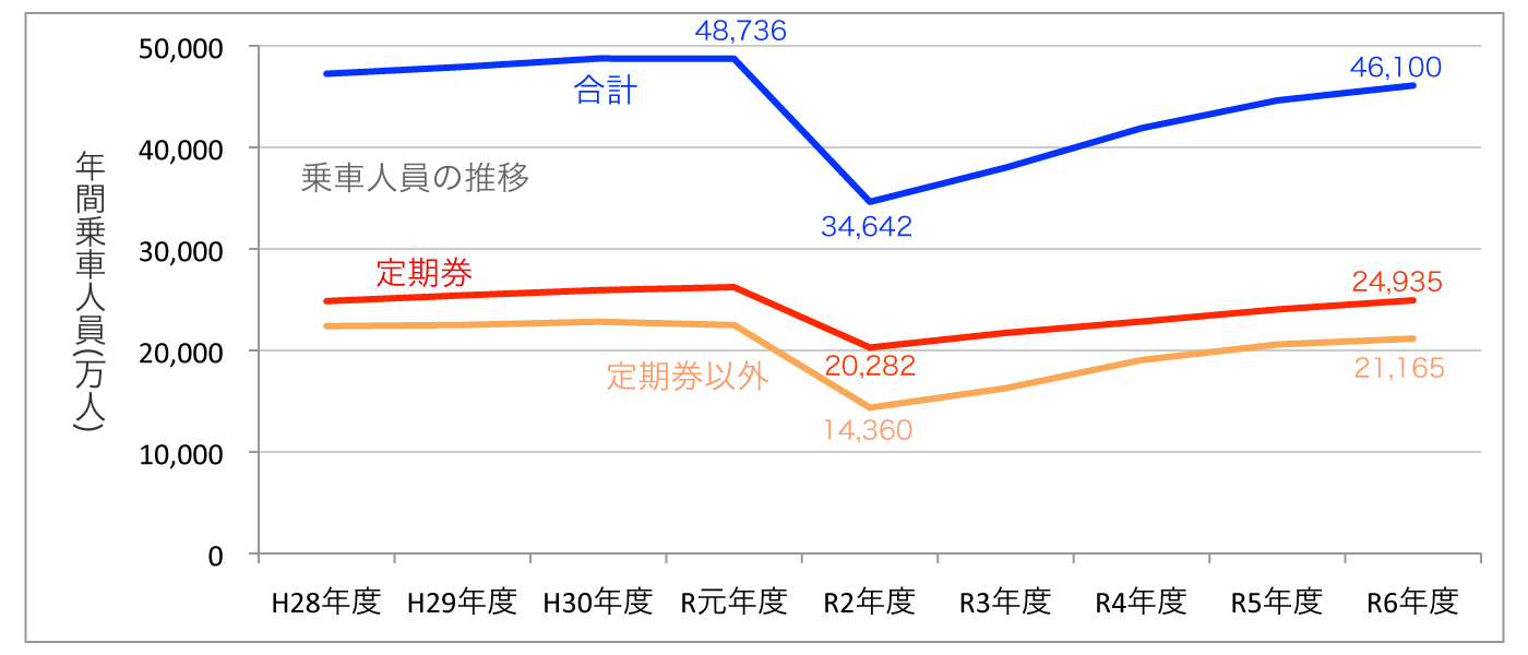 令和7年10月に公表された令和6年度決算によると,1日当たりの乗車人員は126万3,017人(対前年比4万3,563人増)でした.