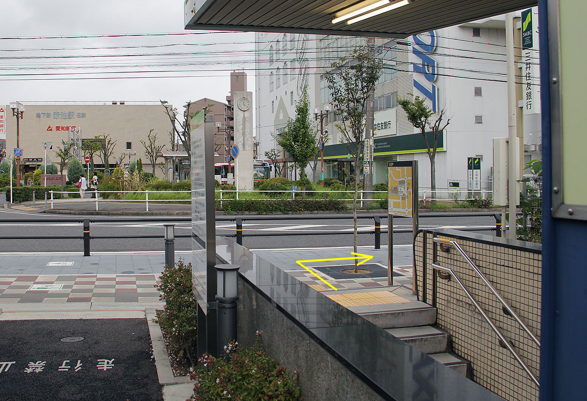 ▲2番出口を地上に出たところ 正面に赤池駅前広場が見える 歩道を右折する |