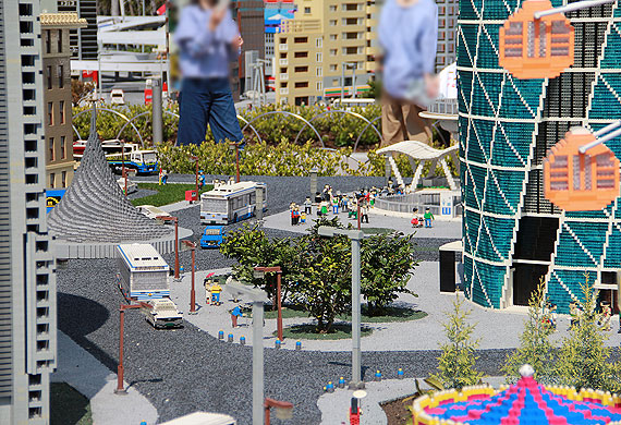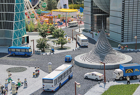 無機質になりがちな模型世界に,賑わいをもたらしているのが,レゴブロックで作られた人や鉄道,バス車両です. 東海道新幹線が走る他,全国各地のバス車両も再現されています.