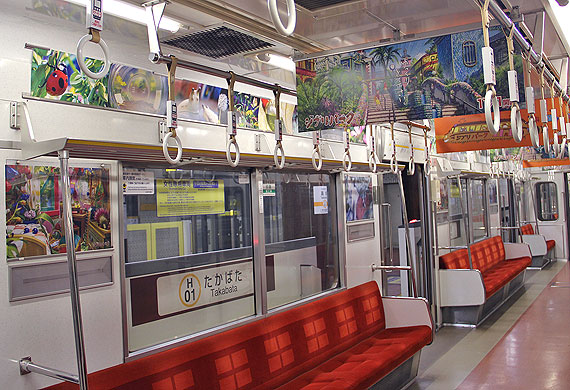 車内広告は車両ごとに異なるデザインで,作品の世界を再現した「ジブリの大倉庫」の展示物の写真56種がドア横や荷物棚の上に掲示されました.