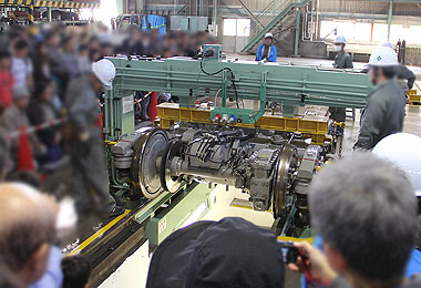 修車工場の中央付近では,1日3回(11時〜,13時〜,14時〜)5050形5652号車を使った15t天井走行クレーンによる電車の吊り上げ実演が行われました.