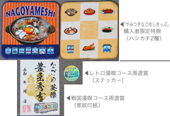 参加記念品(中間賞)として,先着2,000名に家紋印紙とステッカーがプレゼントされました. これに加えて,「やみつきなごめしきっぷ」購入者特典として,先着300名にオリジナルハンカチ(全2種類)もプレゼントされました. |