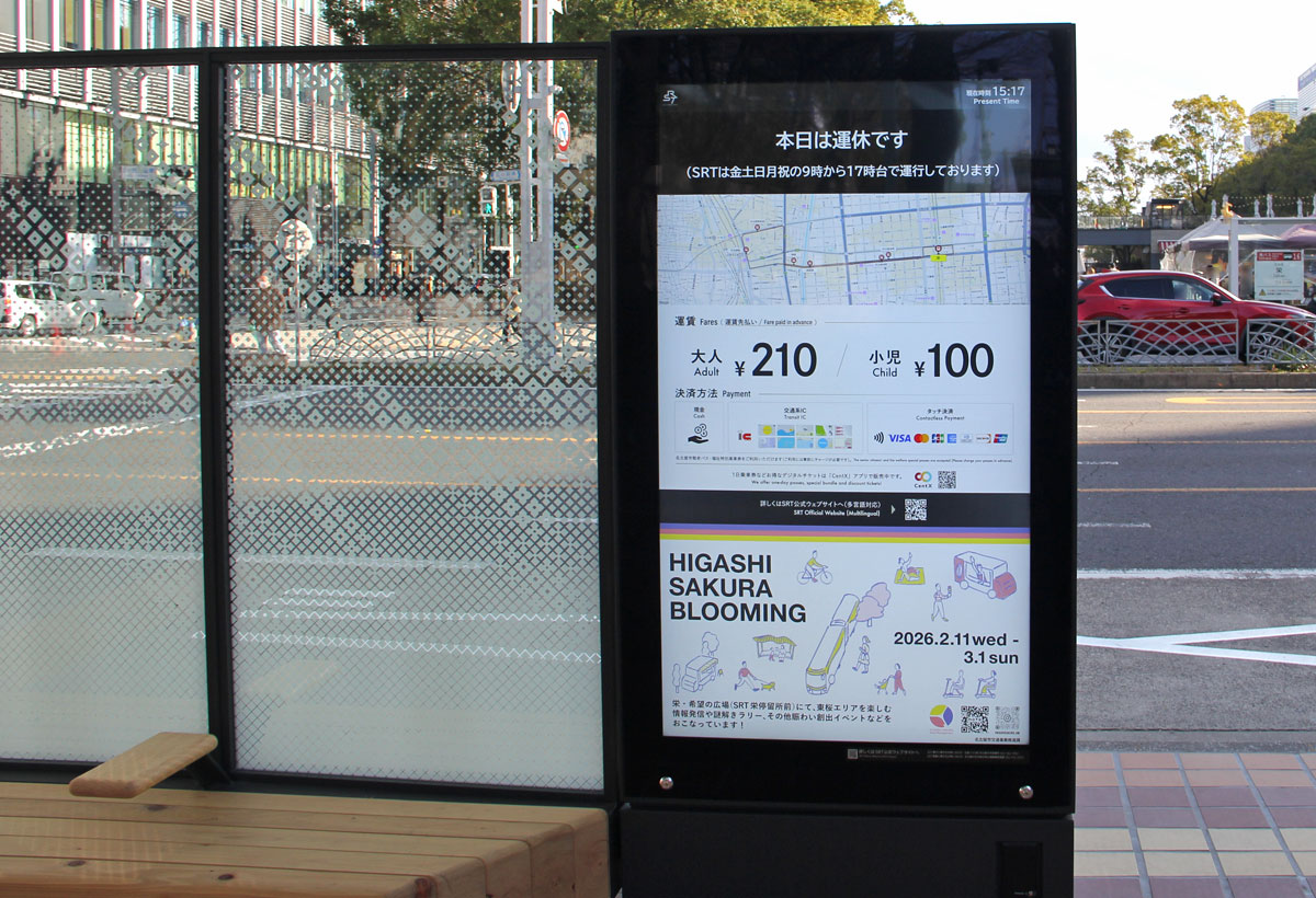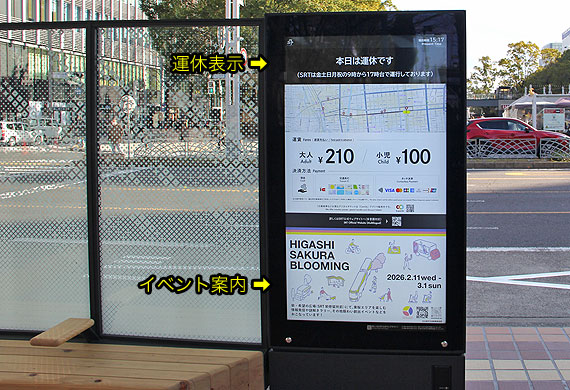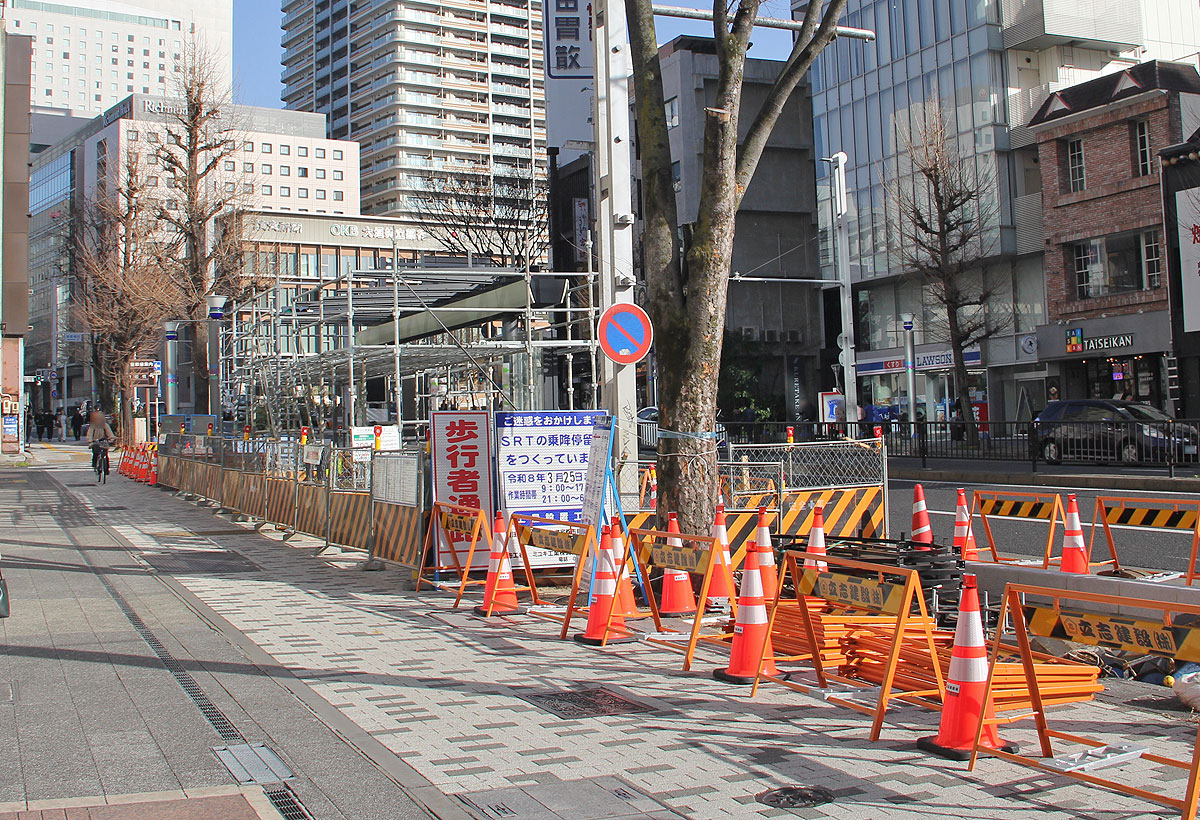 工事遅れ等により,令和8年2月13日のSRT開業に乗降・待合空間整備が間に合わなかったため,一部停留所は臨時バス停で開業を迎えました.