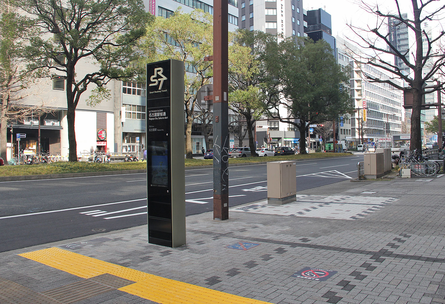 「居心地がよく,人にやさしい空間づくり」がテーマとなっており,沿道の並木と馴染む木製ベンチ,見やすい大型ディスプレイも設置されています.