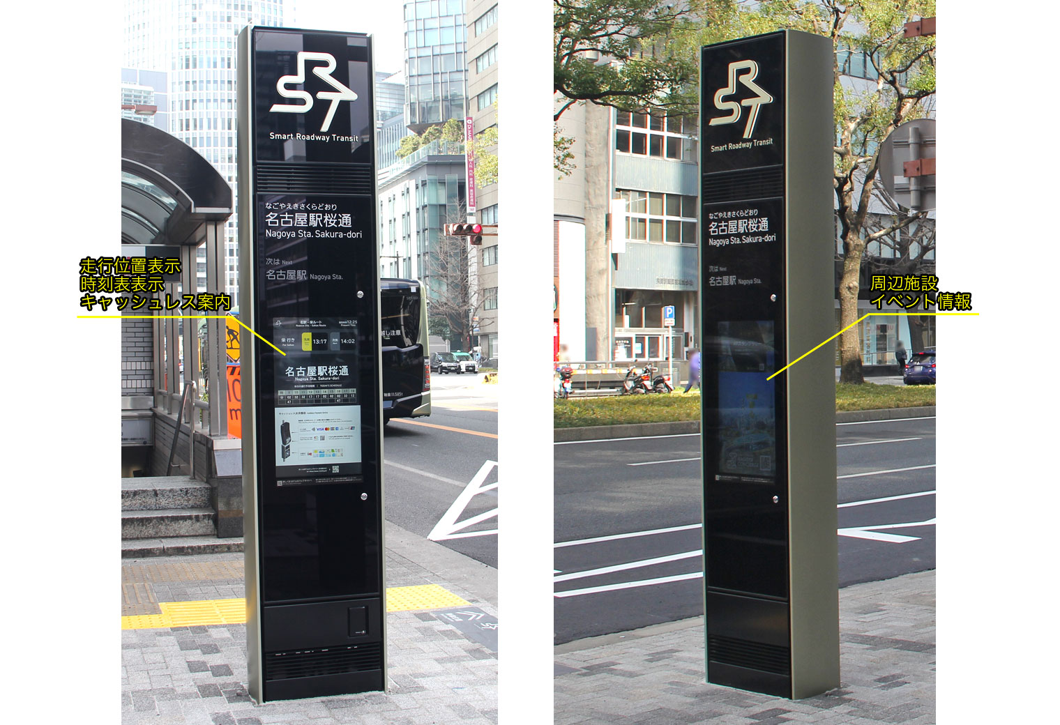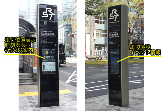 【SRT運行開始時のスマート機能】 ・SRT公式ウェブサイト( https://www.srt.city.nagoya.jp ) →走行位置,時刻表,乗り場,路線図,料金表,お知らせ等 ・走行位置表示システム →バスロケのほか,車内AIカメラで混雑状況もリアルタイム計測 ・デジタルサイネージ →運行情報や走行位置をリアルタイム表示,イベント情報も表示